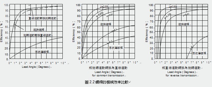 由于滾珠螺桿的螺桿軸及螺帽均是點接觸之滾動運動,所以其效率可高達90%以上。因此其傳動扭矩僅只有傳 統導螺桿的1/3,由圖2.2可看出滾珠螺桿的機械效率遠高于傳統導螺桿。