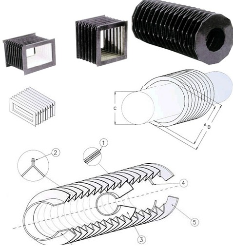 可以用來對絲杠、光杠、立柱、心軸及其它的圓形旋轉柱體進行防護。可以水平或垂直使用。水平使用時建議使用塑料或鋁的支撐環,保持護罩內腔與絲桿之間有一定均勻的距離,延長使用壽命。拉伸長度大時可以在每個折中加上金屬環,提高護罩的穩定性。連接或固定端通常使用金屬法蘭盤,也可以選擇套箍式。