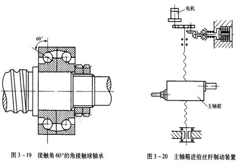 如圖3-20所示為數控臥式鏜床主軸箱進給絲桿制動示意圖。制動裝置的工作過程:機床工作時,電磁鐵通電,使摩擦離合器脫開。運動由步進電動機經減速齒輪傳給絲杠,使主軸箱上下移動。當加工完畢,或中間停車時,步進電動機和電磁鐵同時斷電,借壓力彈簧作用合上摩擦離合器,使絲杠不能傳動,主軸箱便不會下落。